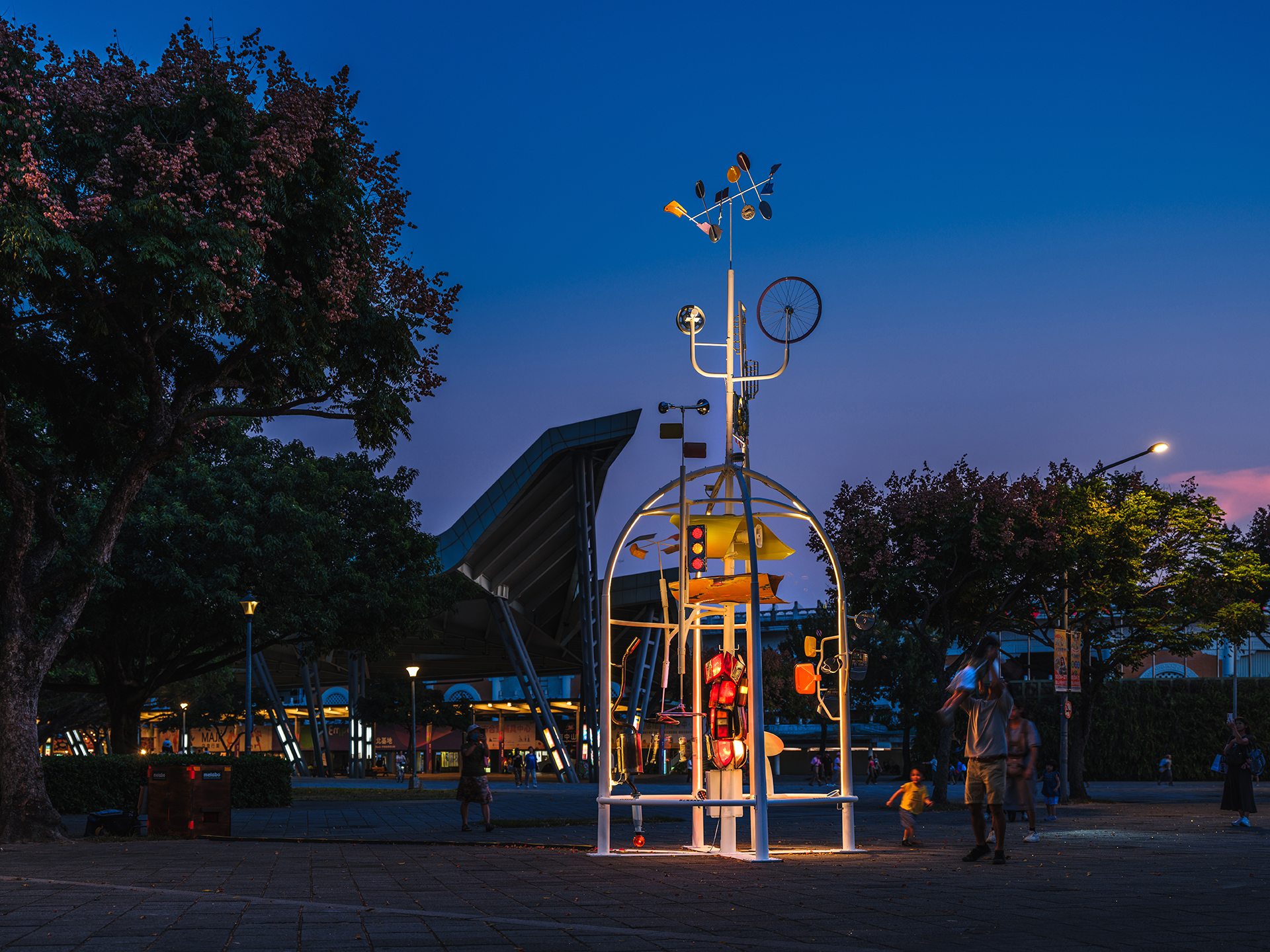 過去的圓山可說是「快樂天堂」的代名詞,從動物園到兒童樂園,承載著跨世代的童年回憶,園區更一度引進全臺罕見的大型機械遊樂設施,一時間蔚為風潮。本件作品取材自圓山兒童樂園的經典遊具形象,融入藝術家對汽車語彙的轉化與重組,撐起多組可隨風轉動的部件,象徵旋轉、飛行與漂浮的快樂記憶。 經由不同形狀材質構件巧思,重現的碰碰車、旋轉木馬等遊具意象,交織陽光與照明而律動,成為時間流動的象徵,喚起對童年遊歷與自由嬉戲的感性想像。